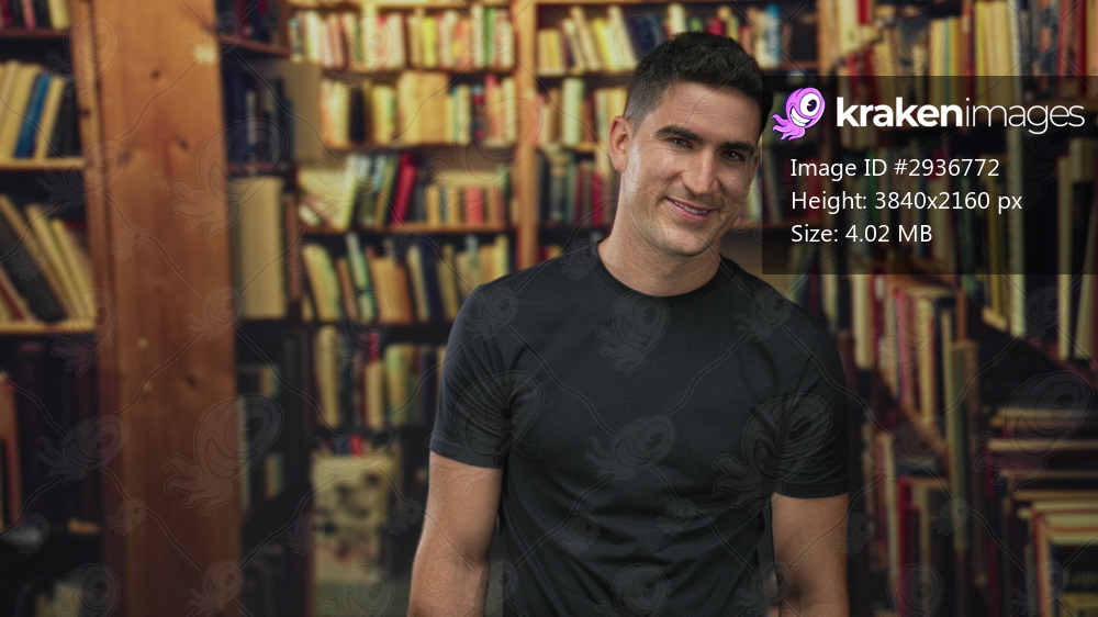 Young man smiling and slightly leaning by library shelves filled with books in a building; calm curiosity.
