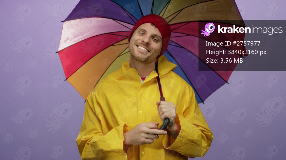 Young man smiling under colorful umbrella wearing yellow raincoat against purple background.