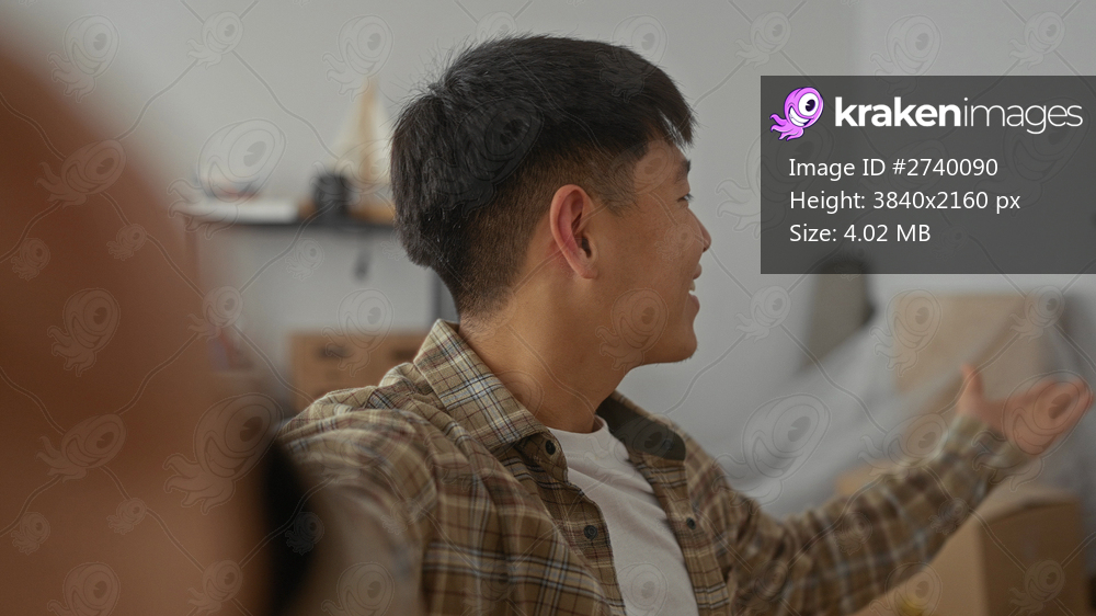 Young man smiling and waving in new apartment living room during video call with cardboard boxes and shelves in the background implying moving day excitement and connection. - Kraken Images