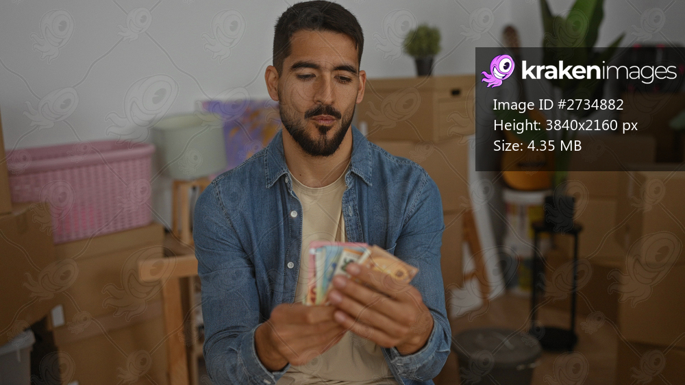 Young man smiling while counting euro banknotes in a cozy living room surrounded by moving boxes, suggesting a recent move or new home experience.