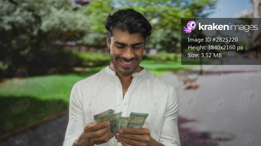 Young man smiling while counting rupee banknotes with hands under sunlight in park; prosperity savings investment security.