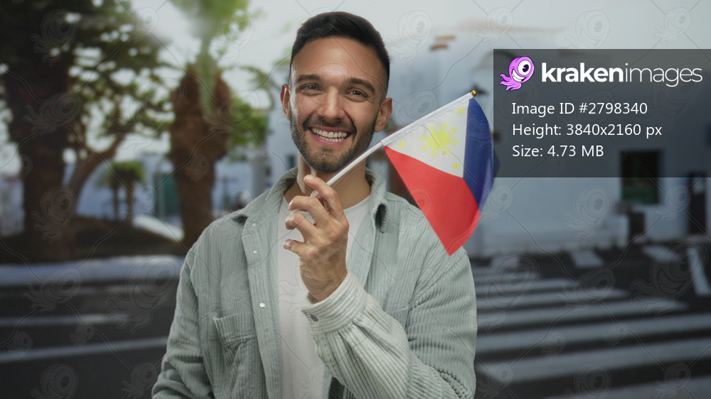 Young man smiling while holding a philippine flag on an urban city street, showcasing cultural pride in a vibrant cityscape background outdoors.