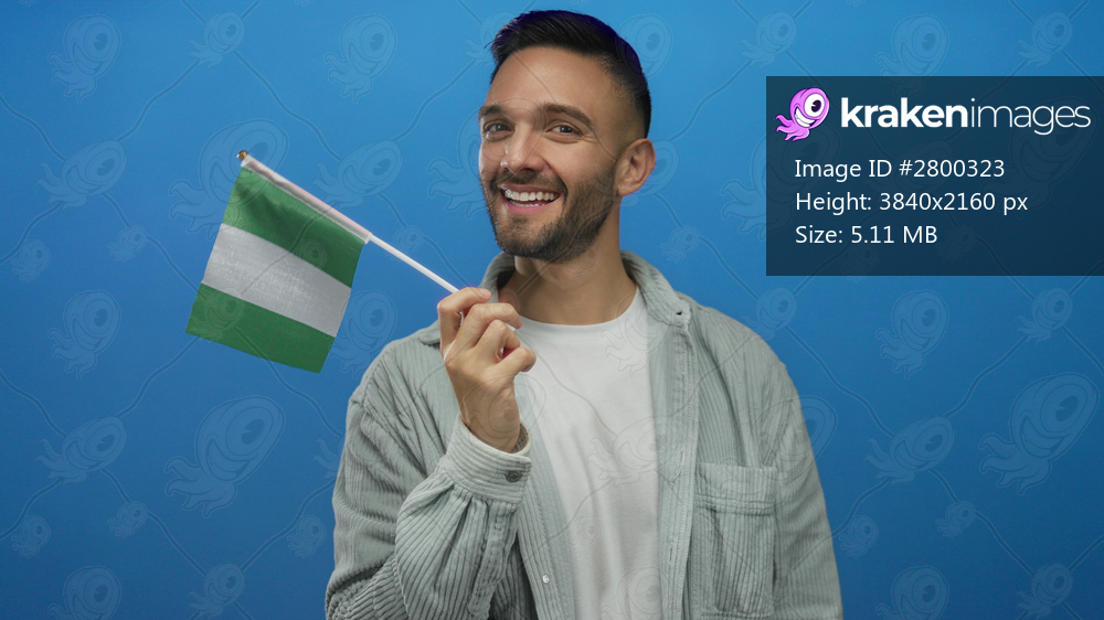 Young man smiling while holding nigerian flag against blue background signifies cultural pride and celebration.