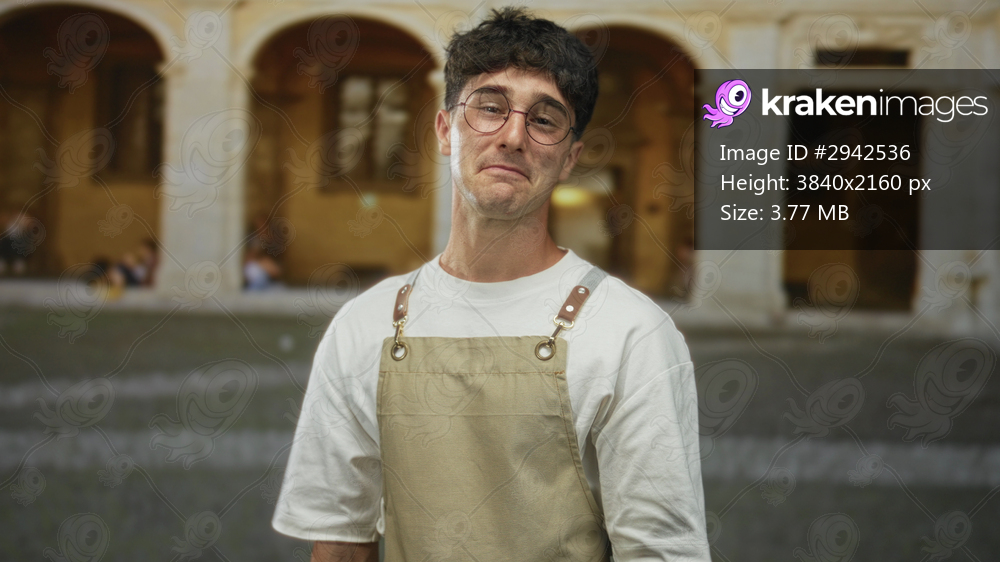 Young man with smirking face and round glasses wearing a tan apron in front of an old building archway; casual confidence.