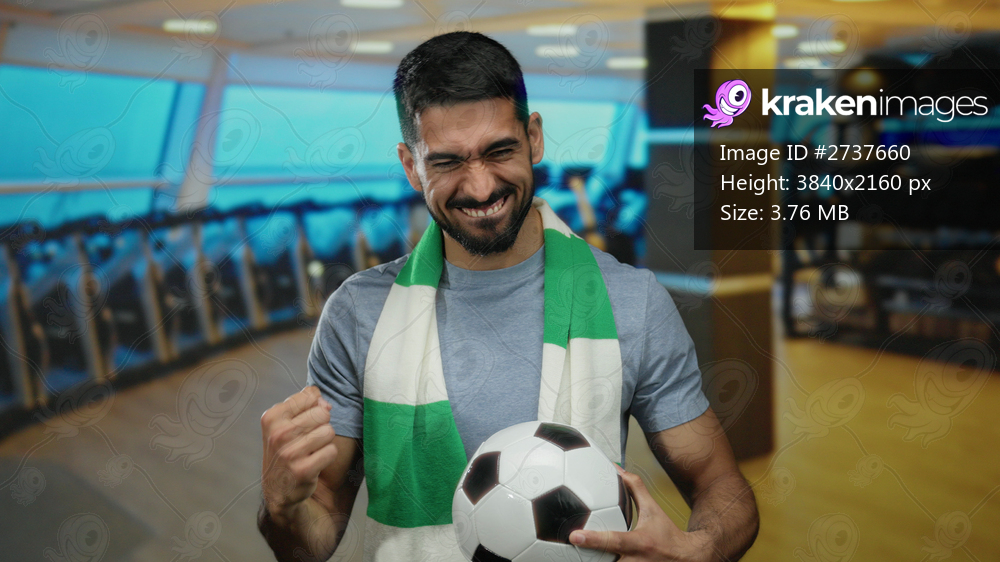 Young man with soccer ball and scarf smiling confidently in gym surrounded by exercise equipment.