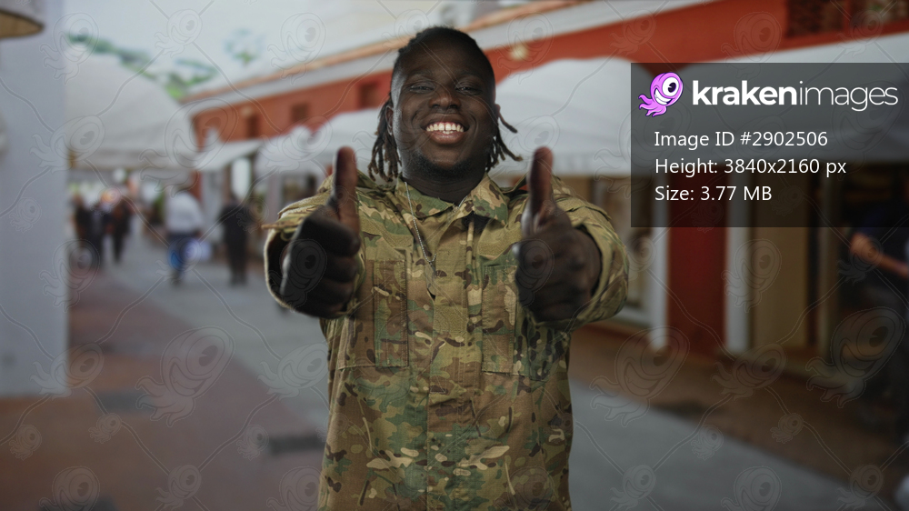 Young man soldier in camouflage uniform gives thumbs up on a busy street lined with white awnings and shops; pride service.
