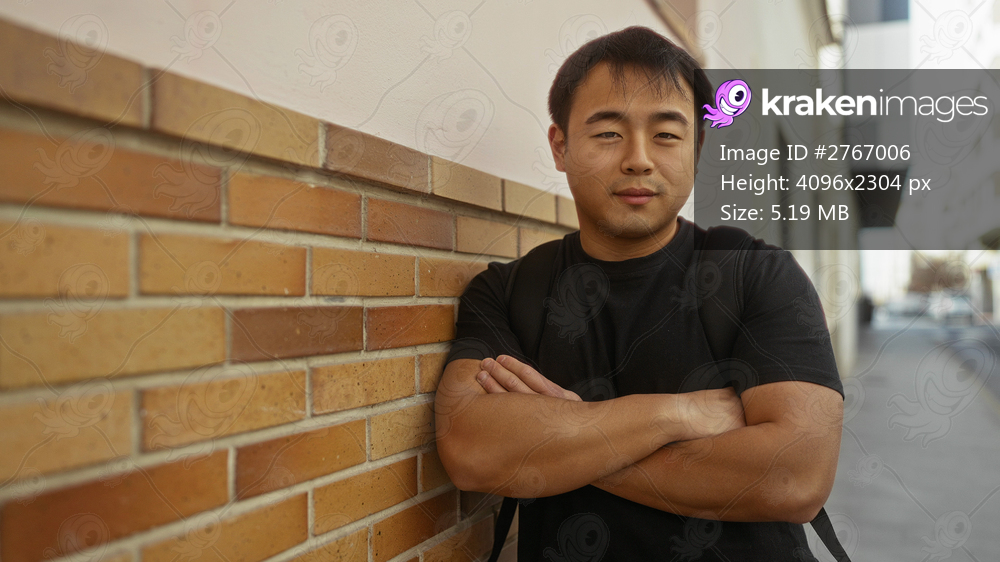 Young man standing against urban brick wall outdoors showcasing casual city environment and confident demeanor.