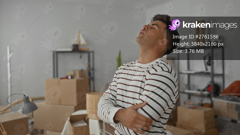 Young man standing with arms crossed in a new home living room surrounded by boxes and decor, creating a vibrant atmosphere.