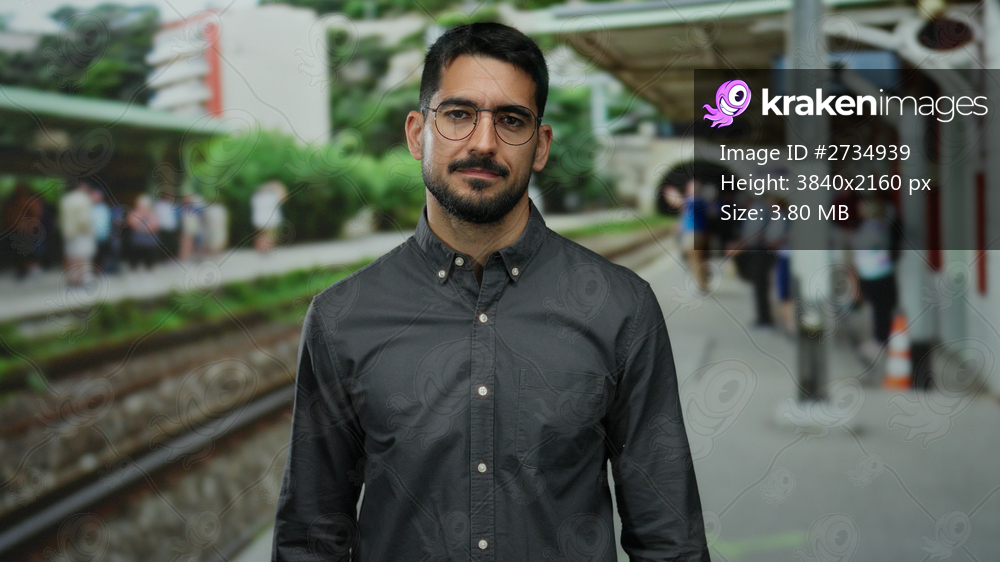 Young man standing confidently at bustling train station outdoor, demonstrating a sense of urban life and transportation.