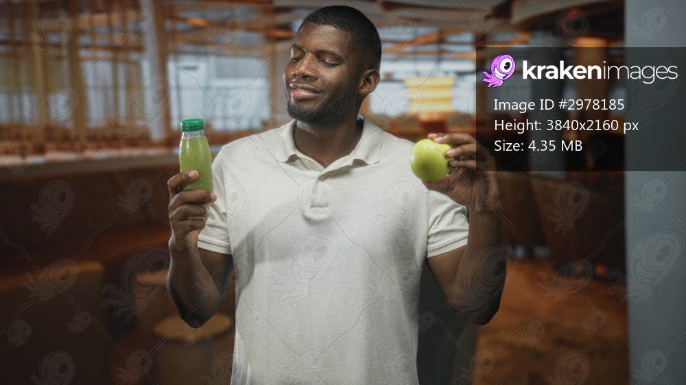 Young man standing, holding green apple and green juice bottle with both hands, smiling and offering the fruit in an airport lounge; health wellness contentment. - Kraken Images