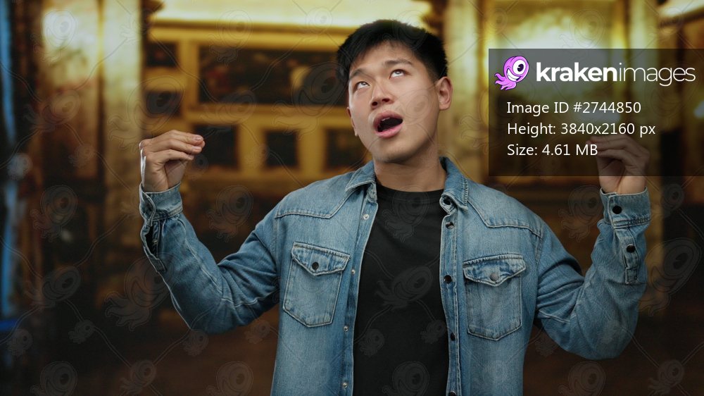 Young man standing in a museum with expressive gestures wearing a denim jacket conveying emotion in an indoor setting with warm lighting suggesting a dramatic scene - Kraken Images