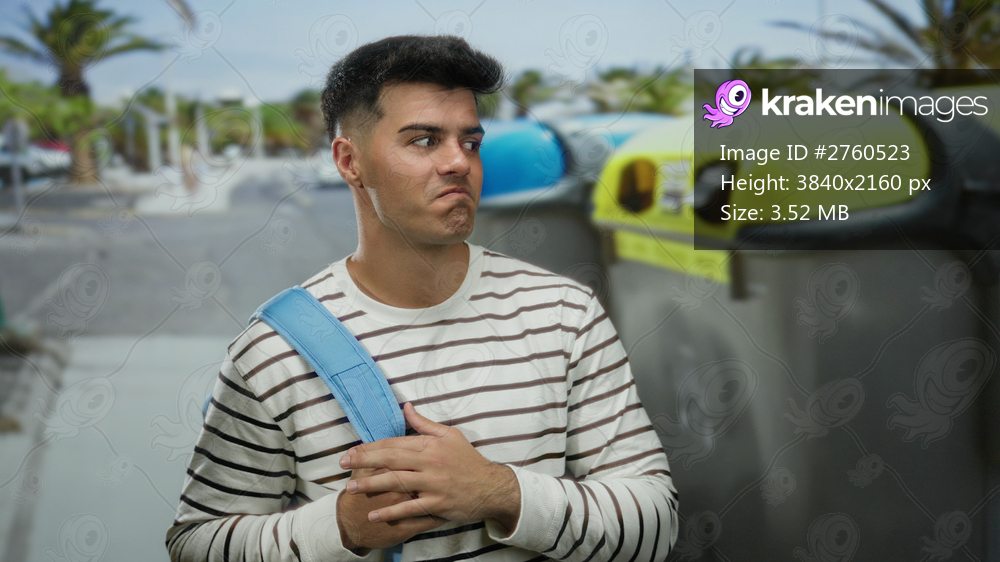 Young man standing on a city street with recycling bins, wearing a striped shirt and blue backpack, showing a pensive expression on a clear day outdoors. - Kraken Images