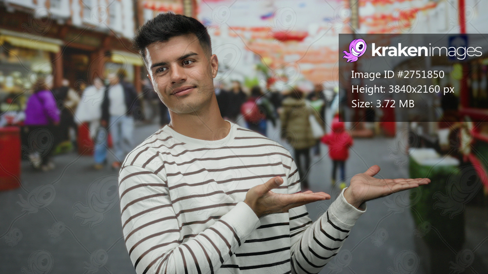 Young man standing on a vibrant city street outdoors, pointing with extended hands, wearing a striped shirt, surrounded by blurred people and colorful storefronts. - Kraken Images