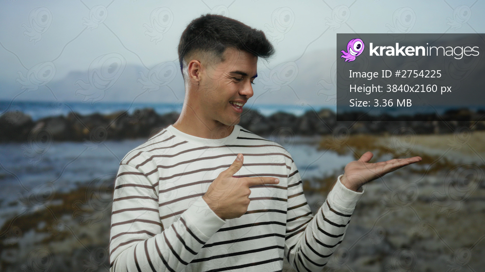 Young man standing on seaside showing thumbs up and presenting open hand while wearing striped shirt with mountains in background and waves on shore under cloudy sky backdrop - Kraken Images