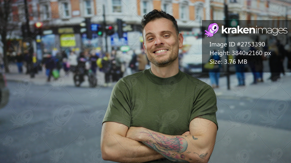 Young man standing on urban street with arms crossed, smiling against city background with pedestrians and traffic, showcasing casual style and vibrant city life. - Kraken Images