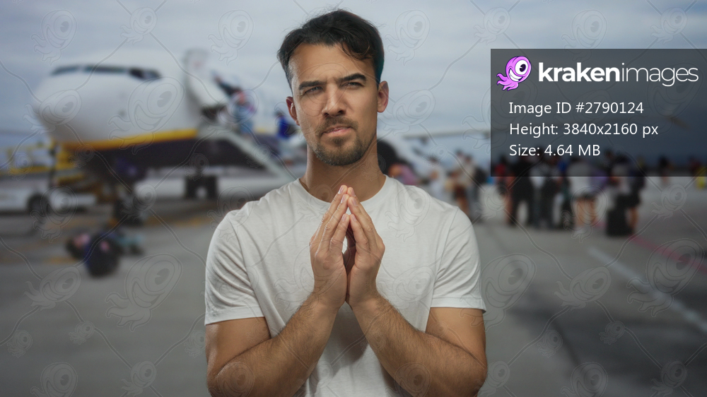 Young man standing outdoors at an airport with an airplane in the background, surrounded by people, wearing a casual white shirt, presenting a thoughtful expression. - Kraken Images