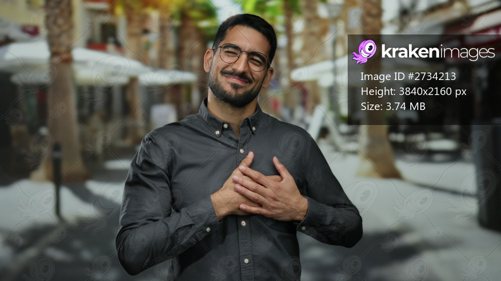 Young man standing outdoors on an urban street forming a heart with hands and smiling attractively.