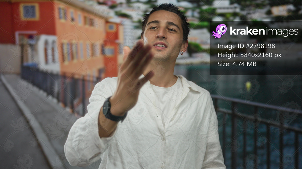 Young man standing outdoors on seaside promenade with eyes closed wearing white shirt, surrounded by blurred buildings and water, reminiscent of serene moment. - Kraken Images