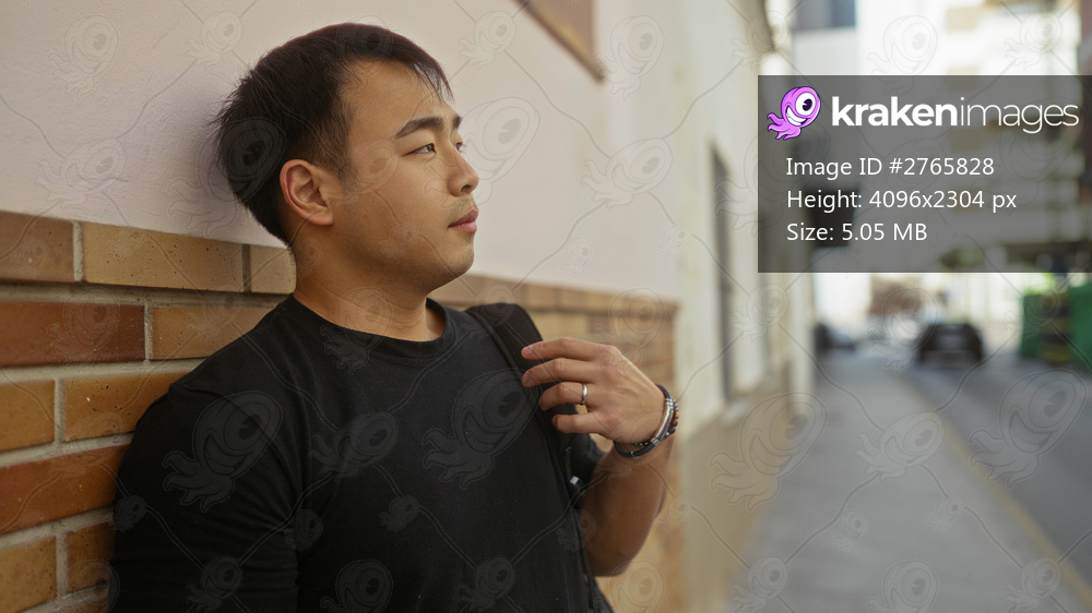Young man stands against a brick wall in an urban setting, showcasing a thoughtful expression on a street in the city.