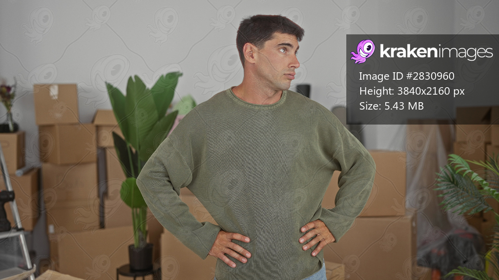 Young man stands with hands on hips beside stacked cardboard boxes in building interior wearing olive sweater; uncertainty.