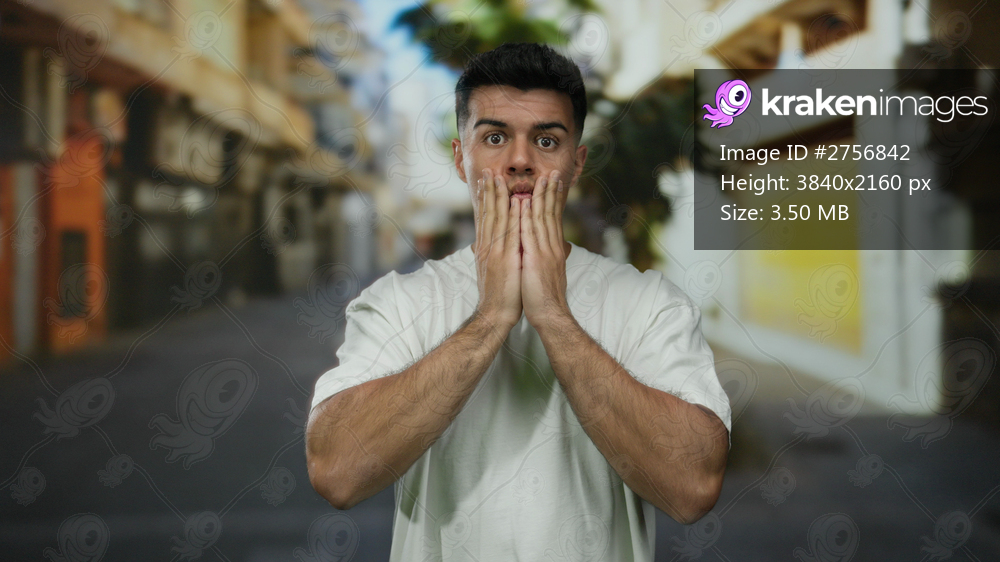Young man stands on a city street looking concerned with hands on face, wearing a casual white shirt under daylight in an urban outdoor setting.