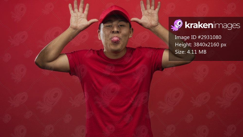 Young man sticking out tongue and raising both hands in studio with red backdrop and visible cap; playful.