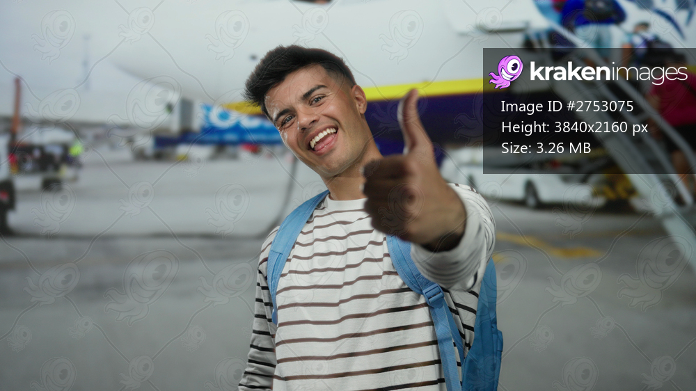 Young man with striped shirt and backpack giving thumbs up at airport against airplane backdrop depicting travel excitement outdoors.