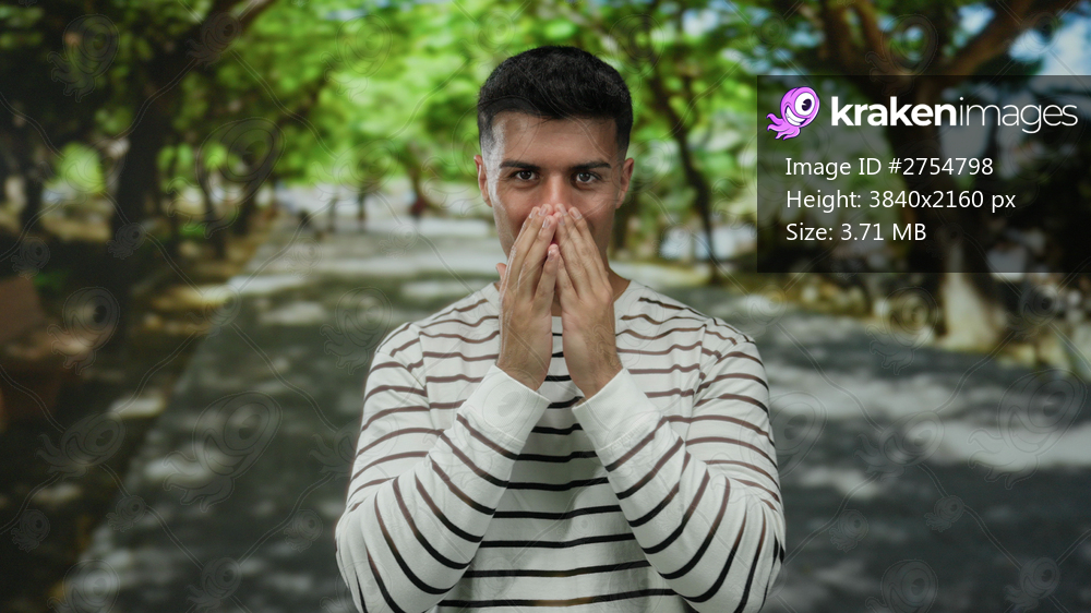 Young man with striped shirt looks surprised in a sunny park setting, surrounded by greenery and shadows.