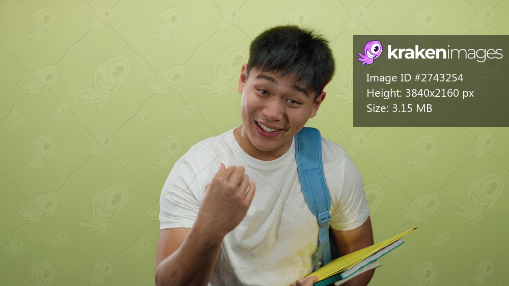 Young man student wearing white shirt and blue backpack gesturing happily against isolated yellow background wall.