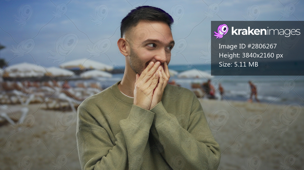 Young man with surprised expression covers mouth with hands on a sandy beach with ocean and umbrellas in the background, capturing an unexpected moment during a sunny seaside day. - Kraken Images