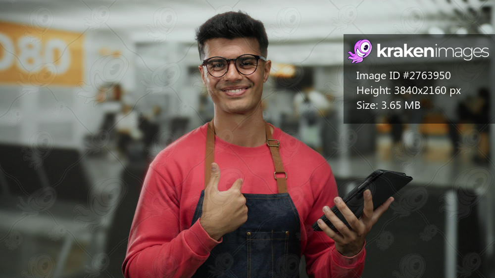 Young man with tablet in apron at busy airport terminal posing confidently indoors smiling attractive.