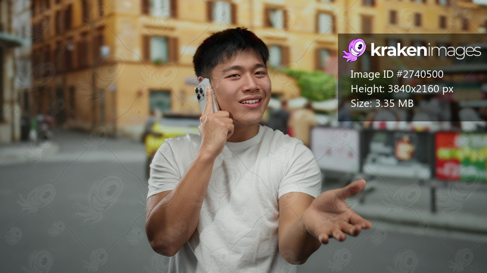 Young man talking on cellphone looking frustrated on busy city street with blurred architecture and people in background.