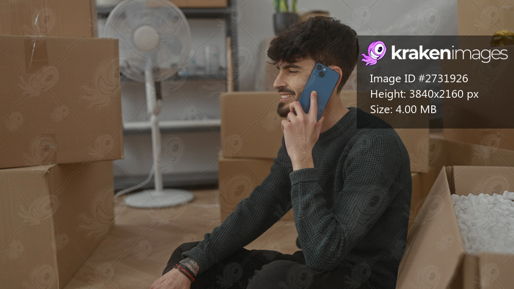 Young man talking on mobile in living room with cardboard boxes during move to new home, sitting relaxed on floor.