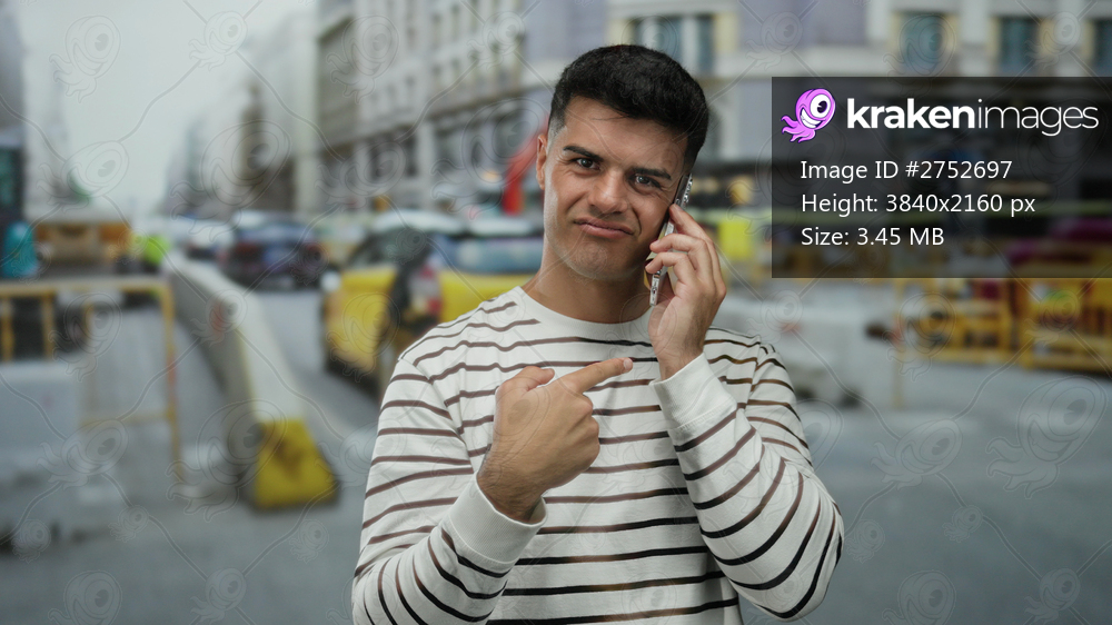 Young man talking on phone at a busy street construction site displaying a mix of expressions amidst urban city hustle.