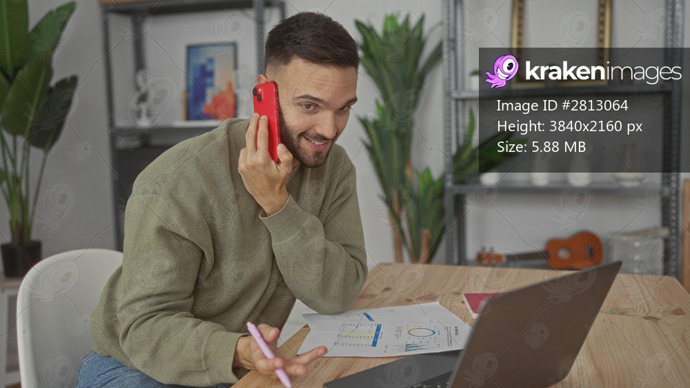 Young man talking on phone while writing notes in living room home office setting with laptop, highlighting casual work environment.