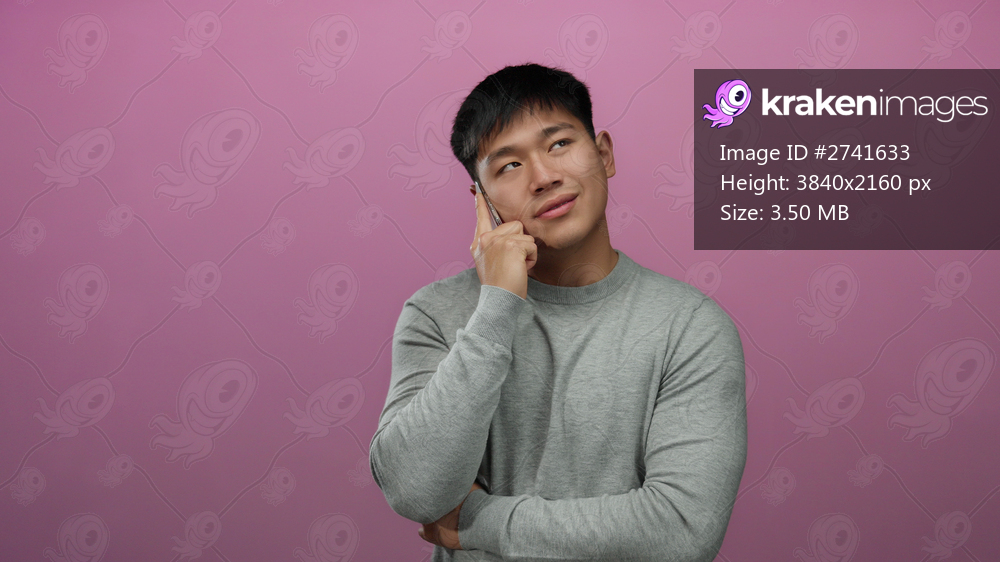 Young man talking on smartphone with a content expression against an isolated pink background, wearing a gray sweater and exuding a calm vibe in an indoor setting. - Kraken Images