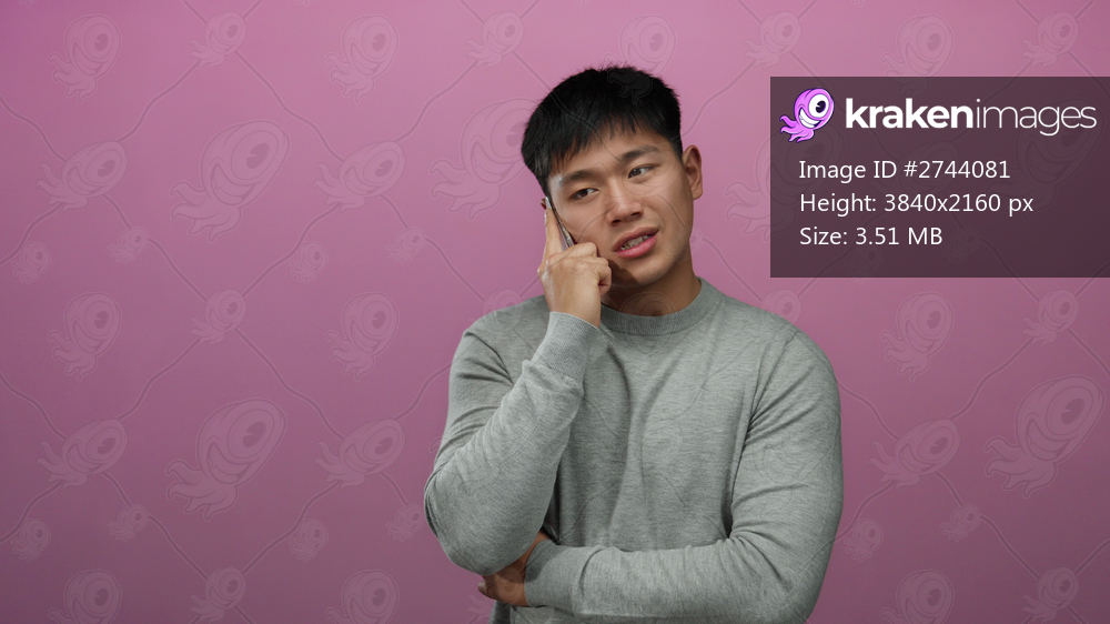 Young man talking on smartphone with a content expression against an isolated pink background, wearing a gray sweater and exuding a calm vibe in an indoor setting. - Kraken Images