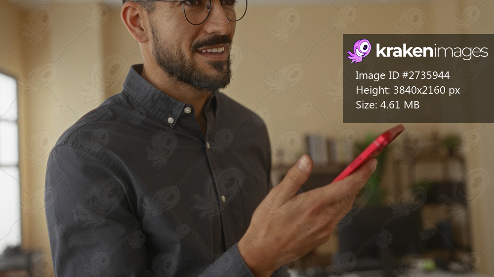Young man talking on smartphone in modern office wearing glasses and casual shirt showcasing professional atmosphere and confident demeanor in workplace interior setting. - Kraken Images