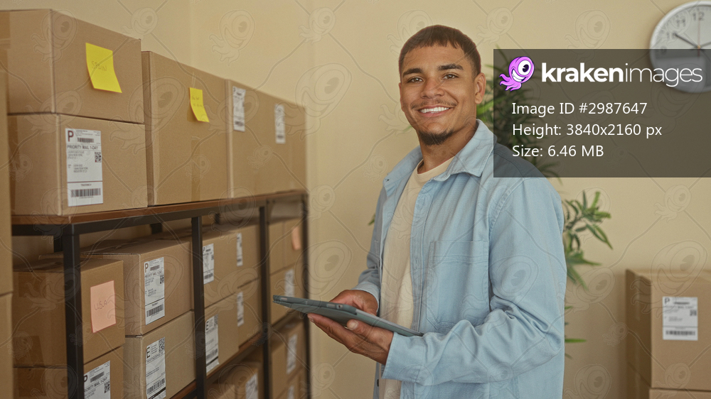 Young man tapping tablet beside stacked shipping boxes on metal shelving in a building, smiling confidently at camera; small business pride.