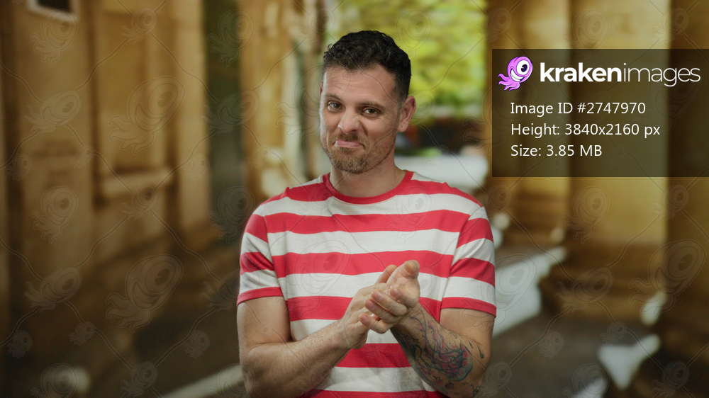 Young man with tattoo clapping outdoors at college shows charisma wearing striped shirt amid ancient architecture spontaneously.