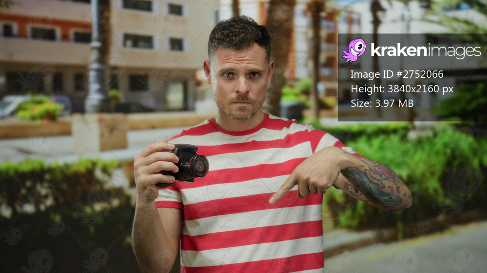 Young man with tattoo holding camera pointing in lively urban street with vibrant buildings