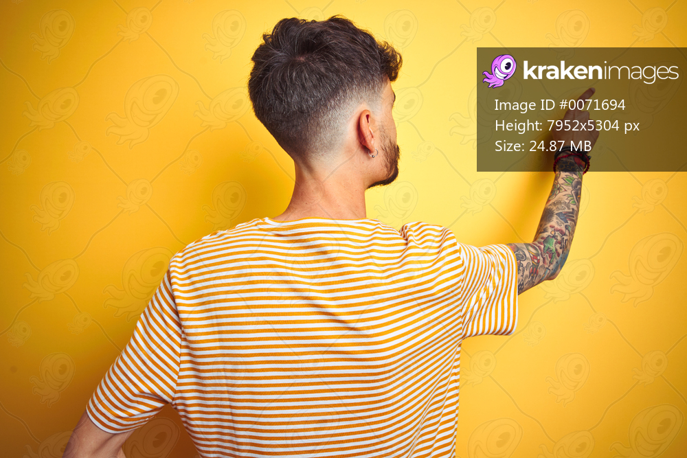 Young man with tattoo wearing striped t-shirt standing over isolated yellow background Posing backwards pointing ahead with finger hand