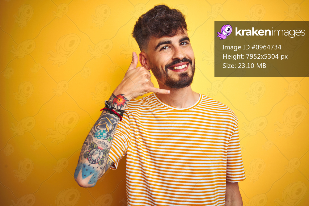 Young man with tattoo wearing striped t-shirt standing over isolated yellow background smiling doing phone gesture with hand and fingers like talking on the telephone. Communicating concepts. - Kraken Images