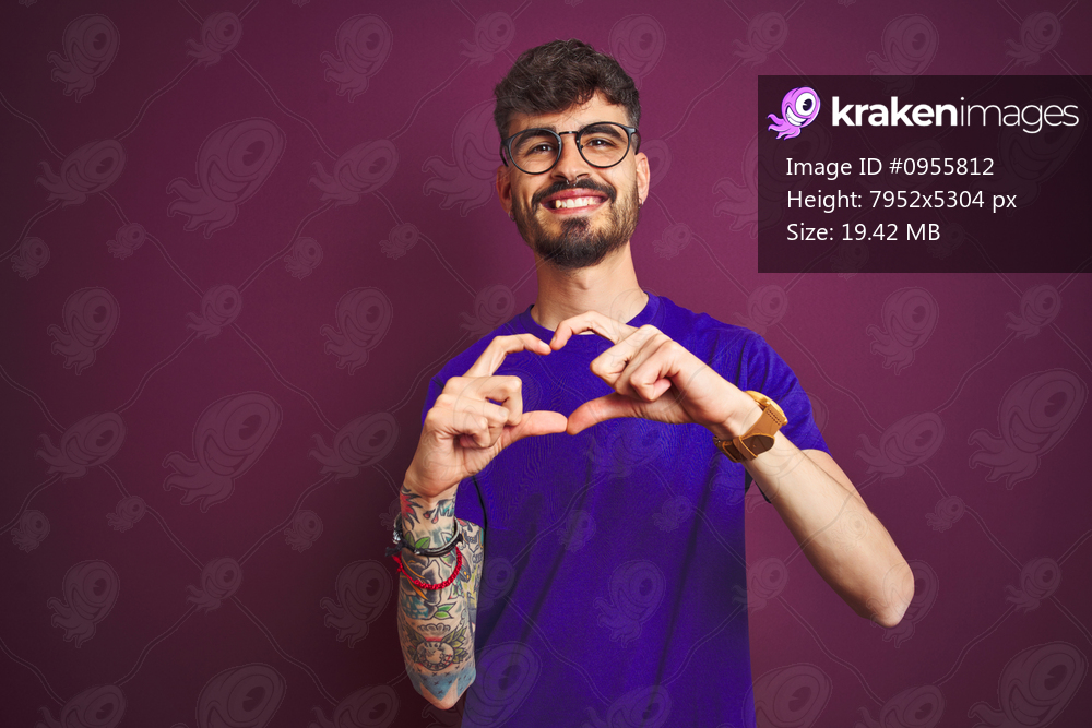 Young man with tattoo wearing t-shirt and glasses standing over isolated purple background smiling in love showing heart symbol and shape with hands. Romantic concept. - Kraken Images