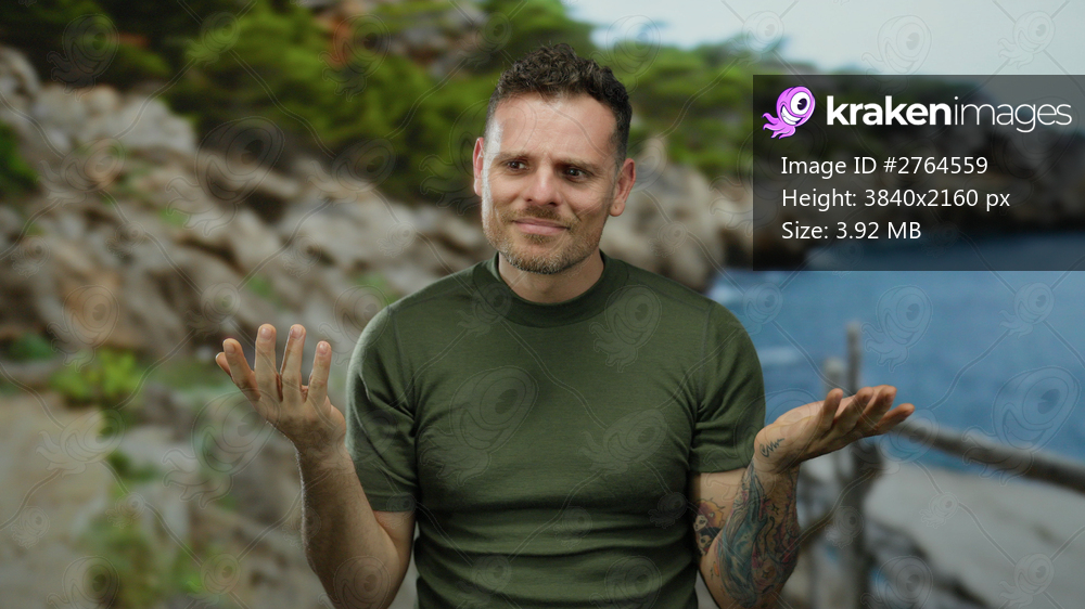 Young man with tattoos gestures expressively at the beach with a rocky coastline in the background under a clear sky.