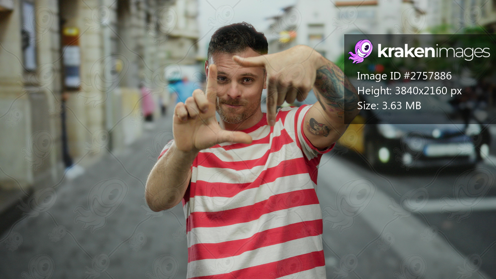 Young man with tattoos making framing gesture on city street wearing red striped shirt outdoors, creating playful and engaging scene.