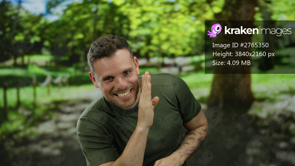 Young man with tattoos playfully whispers outdoors in a lush green park, exuding happiness and charm in a natural setting, surrounded by a vibrant and sunny atmosphere. - Kraken Images