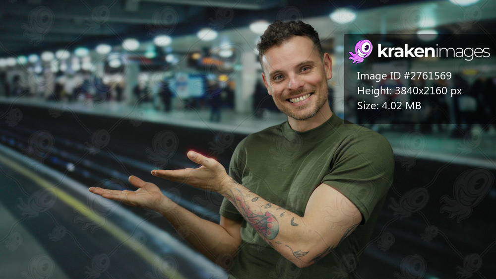 Young man with tattoos smiling at a busy train station, pointing towards the track with other passengers in the background under bright lights.
