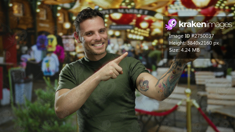 Young man with tattoos smiling and pointing at a festive outdoor market setting.