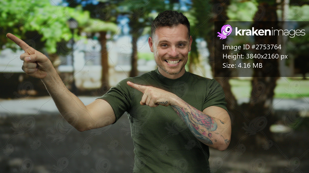 Young man with tattoos smiling and pointing in a lush green park setting capturing a casual outdoor moment.